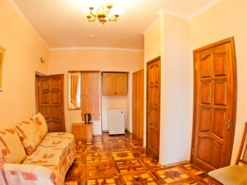 Номер состоит: ванная комната, гостиная, жилая комната, площадь комнат в номере – 9 и 12 кв.м. Мебель: две односпальные кровати, столик, тумбочка, встроенный шкаф, холодильник, телевизор, кондиционер. На лоджии набор летней мебели.